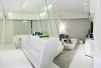 La iluminación artificial en las zonas comunes se ha resuelto con un foseado en forma curva que guarda una fila de luz Led, de modo que proyecta la luz de forma tenue e indirecta. El minimalismo en el diseño de los ambientes se ve acompañado por el mobiliario elegido con tapizados en color blanco y acabados de encimeras, mesas y aparadores en madera lacada color blanco brillo.