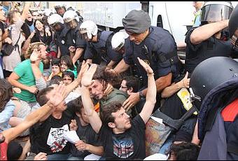 Era cuestión de tiempo. Solo necesitaban una excusa que les permitiera reprimir sin echarse encima críticas, y el fútbol se la ha dado. Las Fuerzas del Desorden Público, o Fuerzas del Orden Privado del Sistema, a sueldo de poderosos y fascistas varios, han desalojado la Plaça Catalunya y la acampada de Lleida empleando el arma que les toca, la violencia; ya se están encargando los medios de comunicación oficiales de apuntalar la acción con sus adminículos ofensivos propios, las mentiras y la manipulación. L@s organizador@s están haciendo un llamamiento para que todo el que pueda vaya a apoyarl@s; ya se sabía que íbamos a perder alguna batalla, que esta eventualidad sea un incentivo para ganar la guerra.