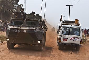 - Un coche de MSF se cruza con un vehículo militar en su camino hacia el hospital Castor, en Bangui. Copyright: Juan Carlos Tomasi/ MSF