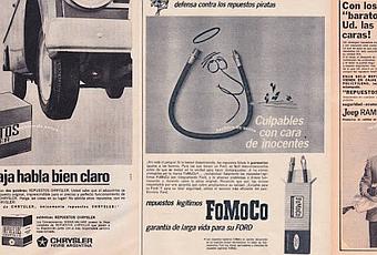 Las publicidades de las empresas Chrysler Fevre Argentina, Ford Motor Argentina e Industrias Kaiser Argentina (IKA) hacen hincapié en lo mismo: el uso de repuestos legítimos en los vehículos que fabricaban. Las marcas eran Dodge, Valiant, Ford, Jeep, Rambler y Renault.