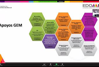 Informó de los apoyos que el Gobernador Alfredo Del Mazo ha dispuesto en apoyo al sector productivo, como microcréditos que otorga la Secretaría de Desarrollo Económico, los estímulos fiscales de la Secretaría de Finanzas, los programas sociales de la Secretaría de Desarrollo Agropecuario y los programas de Apoyo al Desempleo y Autoempleo de la Secretaría del Trabajo.