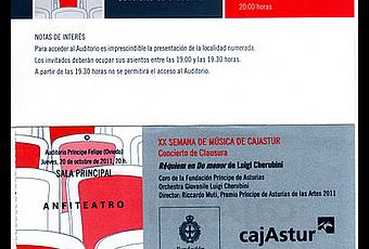 Jueves 20 de octubre, 20:00 horas, Auditorio de Oviedo. Concierto de Clausura de la XX Semana de Música CajAstur: Orquesta Juvenil Luigi Cherubini, Coro de la Fundación Príncipe de Asturias (maestro de coro: José Esteban García Miranda); director: Riccardo Muti, Premio Príncipe de Asturias de las Artes 2011. Réquiem en Do menor (L. Cherubini).