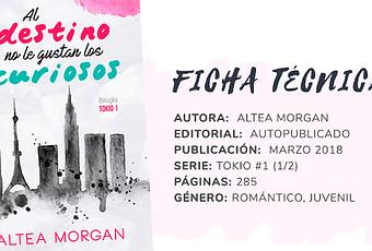 (SIN SPOILERS )¡Hola lectores! Hoy os vengo a hablar de un libro que sin duda se ha convertido en una de mis mejores lecturas de este año. Como veis en el título, se trata de Al destino no les gustan los curiosos, la primera parte de la bilogía Tokio, de la autora Altea Morgan. Antes de comenzar con la reseña propiamente dicha quería comentaros muy brevemente un tema que quiero dejar claro. Se trata de la autopublicación. Parece ser (muchas personas así lo piensan) que un libro por ser Autopublicado va a ser "malo", insustancial o mal escrito. Y no, no es así en absoluto. Por supuesto, hay de todo, pero no os equivoquéis, igual que con los libros de editoriales. Hay libros autopublicados muy bien escritos y preciosos, y libros de editorial que están llenos de faltas y con una historia sin sentido. Así que no creáis que porque un libro sea de editorial significa ya que es bueno o un libro autopublicado sea malo. Dadles oportunidades a las autoras que deciden publicar por su cuenta, porque os llevaréis una grata sorpresa.