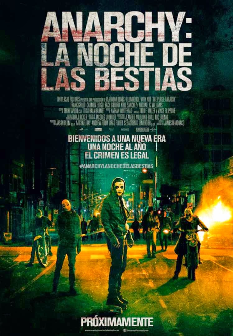 País: EE.UU.Estreno en EE.UU: 18 de julio de 2014Estreno en España: 25 de julio de 2014FICHA DE IMBDThriller que muestra lo que ocurre durante La noche de las bestias fuera de las urbanizaciones de clase media, llevándonos a un futuro supuestamente utópico. El gobierno, ahora en manos de los Nuevos Fundadores de América (NFA), autoriza una “purga” anual de doce horas para conseguir mantener el crimen por debajo del uno por ciento. Las comisarías y los hospitales cierran sus puertas, y durante una noche cada uno es libre de hacer lo que quiera sin temer consecuencia alguna. Esta nueva entrega cuenta la historia de cinco personas que descubrirán en el transcurso de esa noche hasta dónde son capaces de llegar para salvarse, primero a sí mismos y después a los demás.OPINIÓN PERSONAL:Si bien La Purga fue una decepción, ya que la premisa era muy jugosa pero flaqueó en el desarrollo, su secuela, Anarchy: La noche de las bestias, se redime por completo, convirtiéndose en una de las películas más cañeras del año. Y sí, contar con Michael Bay en la producción ayuda. Si de algo sabe este hombre es de acción, una trepidante de la que hace gala esta película, que nos mantiene también en suspense de comienzo a fin.