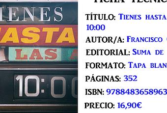 Así comienza Tienes hasta las 10, una emocionante historia de intriga y suspense en la que Francisco Castro construye una trama que contiene, a su vez, muchas historias diferentes. A través de correos electrónicos, cartas y otros tipos de pistas misteriosas y sorprendentes, el propio padre del protagonista después de muerto, o alguien que se hace pasar por él, va a forzarlo a investigar un suceso terrible del pasado que aún no ha sido resuelto.