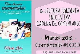 El 26 de Marzo de 2016 fue la fecha límite marcada para la publicación de las reseñas de la 8ª Lectura Conjunta de Cadena de Comentarios, con la novela Cinco Días Para Enamorarse de la autora Marta Lobo.Para esta ocasión contamos con la generosidad de la autora, que nos facilitó varios ejemplares en formato digital para repartir entre los miembros que quisieran anotarse a la Lectura Conjunta.