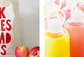 Izq. Bolsa de tela para la compra; Dcha. Botella de cristal BKR