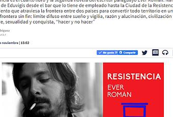 Resistencia es el cuarto libro y la segunda novela del escritor paraguayo Ever Román. Narra el viaje de Eduvigis desde el bar que lo tiene de empleado hasta la Ciudad de la Resistencia. Movimiento que atraviesa la frontera entre dos países para convertir todo territorio en una (trans) frontera sin fin: límite difuso entre sueño y vigilia, razón y alucinación, civilización y barbarie, sexualidad y conquista, “hacer y no hacer”