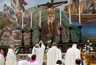 Y la liturgia tiene sentido porque es la forma en que la Iglesia peregrina se une en el tiempo a lo que de perpetuo hace la Iglesia triunfante en la eternidad, adorar a Dios "dándole culto día y noche en su Santuario" (Ap. 7, 15), pero no diseñando tal o cual modelo de adoración que nos parezca más o menos correcto, sino tal como ocurre en el cielo según lo relata el libro de Apocalipsis, con la asamblea de los redimidos, que están ante la presencia del Cordero, y con y por medio del Cordero, adoran al Padre que está sentado en el trono, y que es lo que hacemos en la Misa; el Ministro invoca al Espíritu Santo para que por su poder nuestros dones de pan y vino se conviertan en el Cordero de Dios, y con Él, ofrecernos al Padre.
