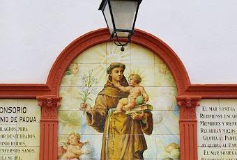 De este oficio litúrgico en uso en la Orden Franciscana durante más de seis siglos, fue separado el citado Responsorio y convertido en oración popularísima a San Antonio. Se le llama “responsorio milagroso”, porque enumera diez grupos de milagros atribuidos al Santo y porque es una invitación persuasiva y eficaz a todos los fieles para que recurran al patrocinio de este Santo taumaturgo en sus varias necesidades espirituales y materiales. Este responsorio podemos verlo en la fachada del Convento de San Antonio de Padua, en la Calle San Vicente. Fue pintado en 1948 por Enrique Orce Mármol y manufacturado en la Fábrica de la Viuda de Tova Villaba. En esta representación de San Antonio lo vemos con un libro en una de las manos del Santo, como se mostraba habitualmente en la antigüedad, sobre el libro el mundo coronado por una cruz, que rememora el carácter misionario del Santo y su vocación por predicar. Este símbolo muestra además la victoria de Jesucristo sobre el pecado en todo el mundo.