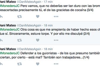 Vuestro programa es de humor –de lo mejor de la programación de nuestro país- y me parece genial que os riais de todo lo risible, especialmente de todos los que pasamos de una manera u otra por la política. Somos patéticos y no merecemos mucho respeto. Los compañeros del SAT, que están luchando contra el atraso de Andalucía merecen, por el contrario, todo nuestro respeto. Reírse de Bódalo y de su compañero el día que entra en la cárcel y llamarles analfabetos, ignorantes y gordos no corresponde a El intermedio. Es propio de otros lugares. Y estoy convencido de que estamos totalmente de acuerdo. Y porque lo sé, te escribo con cariño y confianza. Seguiré disfrutando de vuestro programa y de tu sección. Y sé que de esta pequeña disputa todos salimos un poco mejores de como entramos. En mi caso te lo aseguro. Un abrazo y nos vemos.
