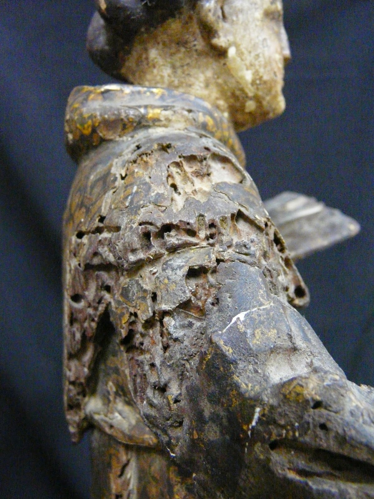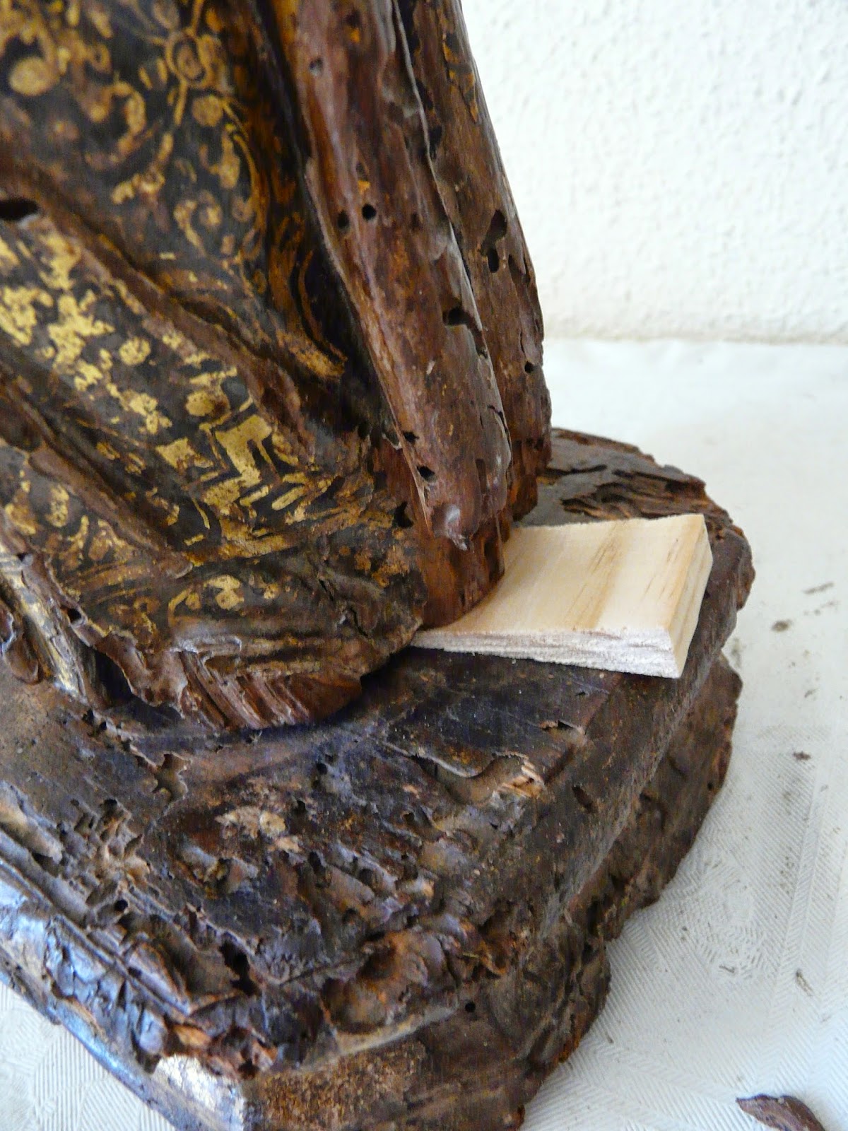 En el caso de la peana también se observan las mismas alteraciones descritas en la pieza. El estado de conservación de la misma es bastante malo y precario como se pone de manifiesto en las siguiente fotografía.