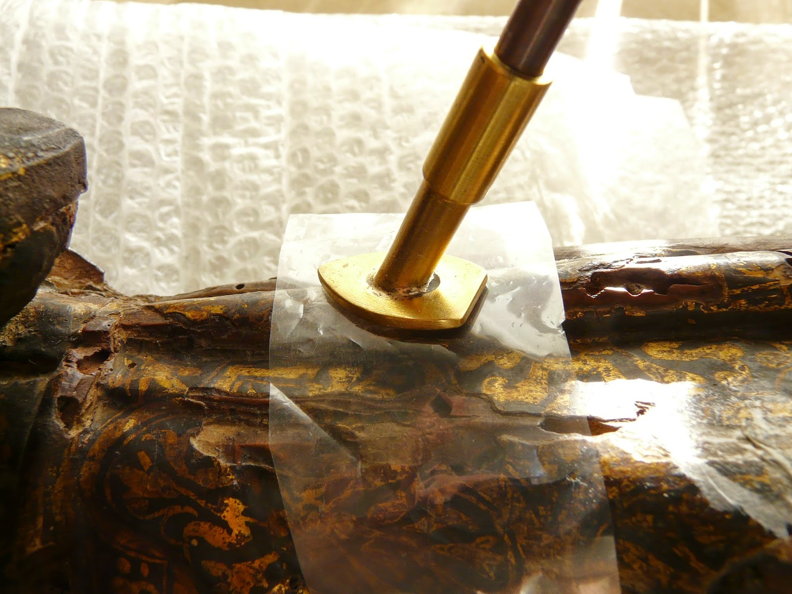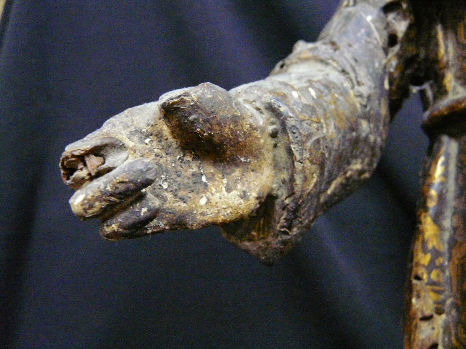 Ya en el estudio previo de la obra se aprecian diferencias en la talla y en la decoración tanto del antebrazo derecho, como del izquierdo. Como podéis ver por la fotografía, es de factura más facetada y el dorado no es oro fino sino purpurina.
