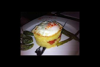 Solamente quedaban dos entrantes. Habíamos quedado que según fuéramos de hambre, pediríamos una carne al centro, pero nos habló tan bien el chef de la carrillera que no podíamos dejar pasar la oportunidad de probarla. Ya tenemos para escribir un libro sobre las carrilleras en los bares de Murcia. Los entrantes que faltaban eran ambos de huevo. Un huevo con gulas y boniato, muy parecido al que tomamos la última vez que comimos en Lagún. El camarero lo trajo y en la mesa lo troceó y mezcló. Me gustó más con patatas paja que con boniatos a lo pobre. Y por último, los llamados sombreros de patata con chorizo. Un timbal de patatas a lo pobre que ocultaban el chorizo y todo coronado por un huevo a la plancha. Una presentación moderna para unos huevos con chorizo de toda la vida de Dios. Como ellos dicen, cocina innovadora a la par que tradicional. Para muestra, un botón.Todos los entrantes nos gustaron, pero seguramente los hubiesemos disfrutado más si en algún momento hubiesen cambiado los platos, y es que desde la ensalada hasta los huevos, en ningún momento nos los cambiaron. Y con restos de vinagre de Módena, de miel de caña o de queso y foie, los huevos no saben igual.La famosa carrillera era la misma que nos habían puesto de aperitivo, al venir con una base de paratas y más salsa ganaba bastante. Como casi siempre, la salsa era lo mejor del plato. Estaría deliciosa si no hubiesen millones de granos de pimienta en el plato. El camarero lo justificó como que tenían que dar sabor a la carne, que nadie lo discute. Pero en el emplatado podrían haberla eliminado. El vino que habíamos pedido fue un Hécula 2008, de Yecla, que estaba a muy buen precio y para una cena de picoteo hizo su papel.