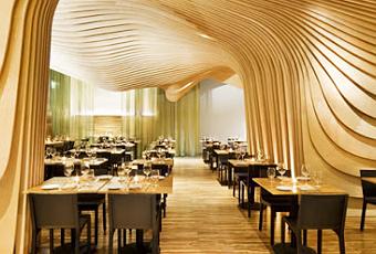 Este espacio ha sido reformado de una manera muy interesante: la pared y techos se decoran con elemento de onda, hecha de singulares piezas de abedul de tres cuartos de pulgada de madera contrachapada adheridos juntos en un escenario que se asemeja a un rompecabezas. Las columnas y el almacen de vino, en el centro de la sala, sirven para mantener la ficción, y parecen estar suspendidos del techo.