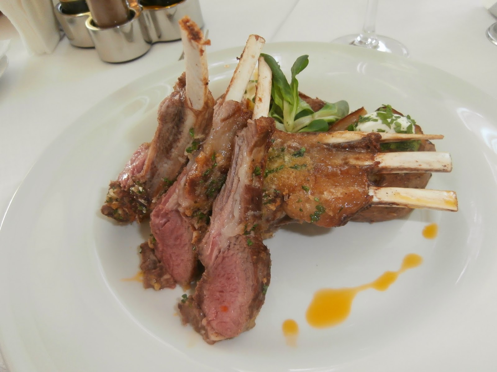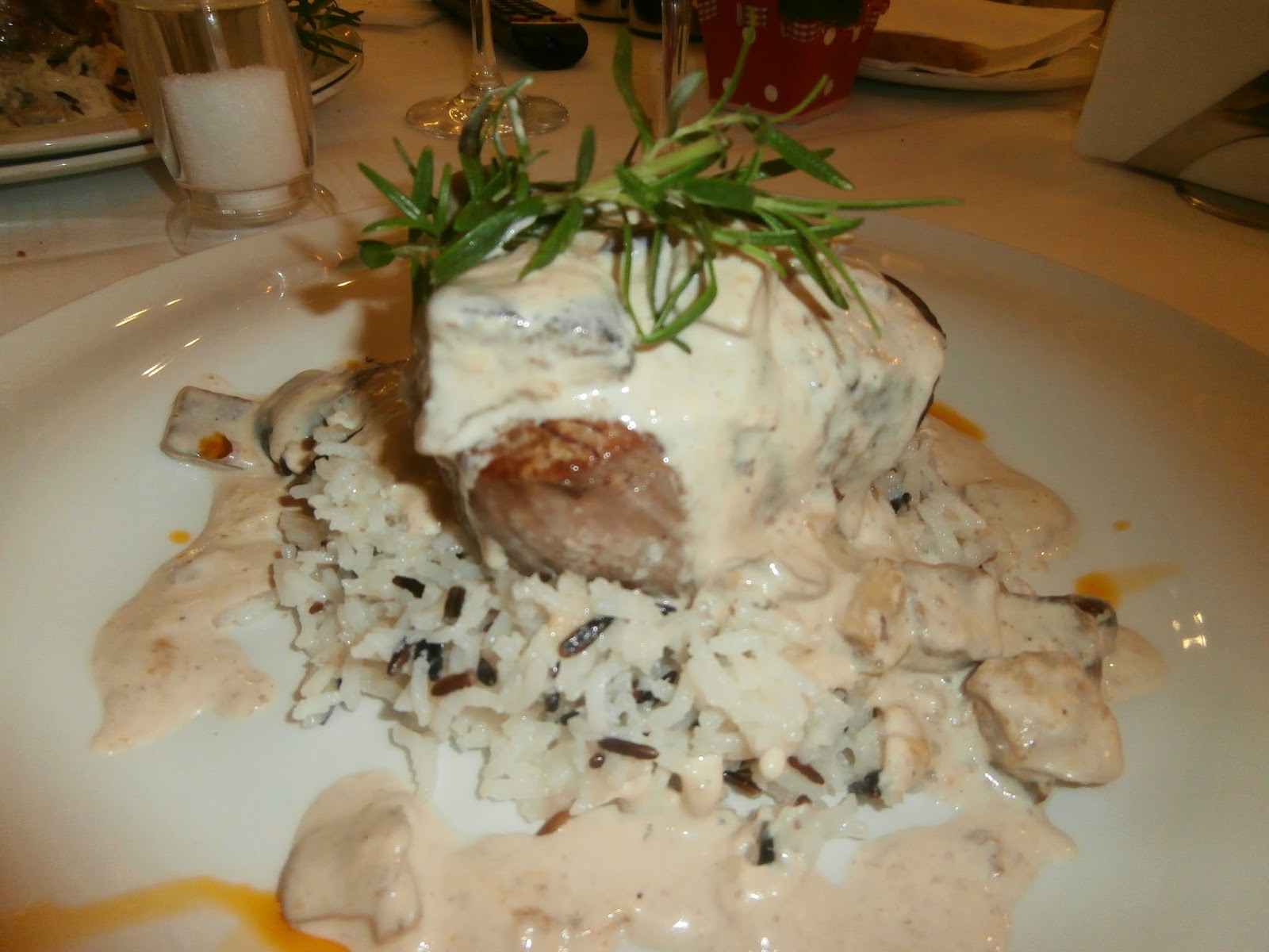 El plato principal que voy a describir a continuación, corresponde a dos diferentes comidas, ya que al día siguiente antes de partir para el aeropuerto, pedimos comer un poco para marchar con la tripa llena, entonces ese es el motivo por el cual para la cena del día 22 de Abril 2015 descrita en este post tome un tierno, jugoso y muy sabroso solomillo de buey, acompañado por una deliciosa salsa de champiñones y todo ello sobre un muy acertado risotto con setas perfumado al romero... Y aprovecho este mismo artículo para incluir el único plato que tome al mediodía del 23 de Abril 2015, y poder así registrar ambos platos de una misma vez y poder recordar para la posteridad, unas deliciosos Costillas de Cordero Asadas con una deliciosa salsa de Miel y Mostaza con hierbas aromáticas locales, el cual francamente me supo a muy poco.