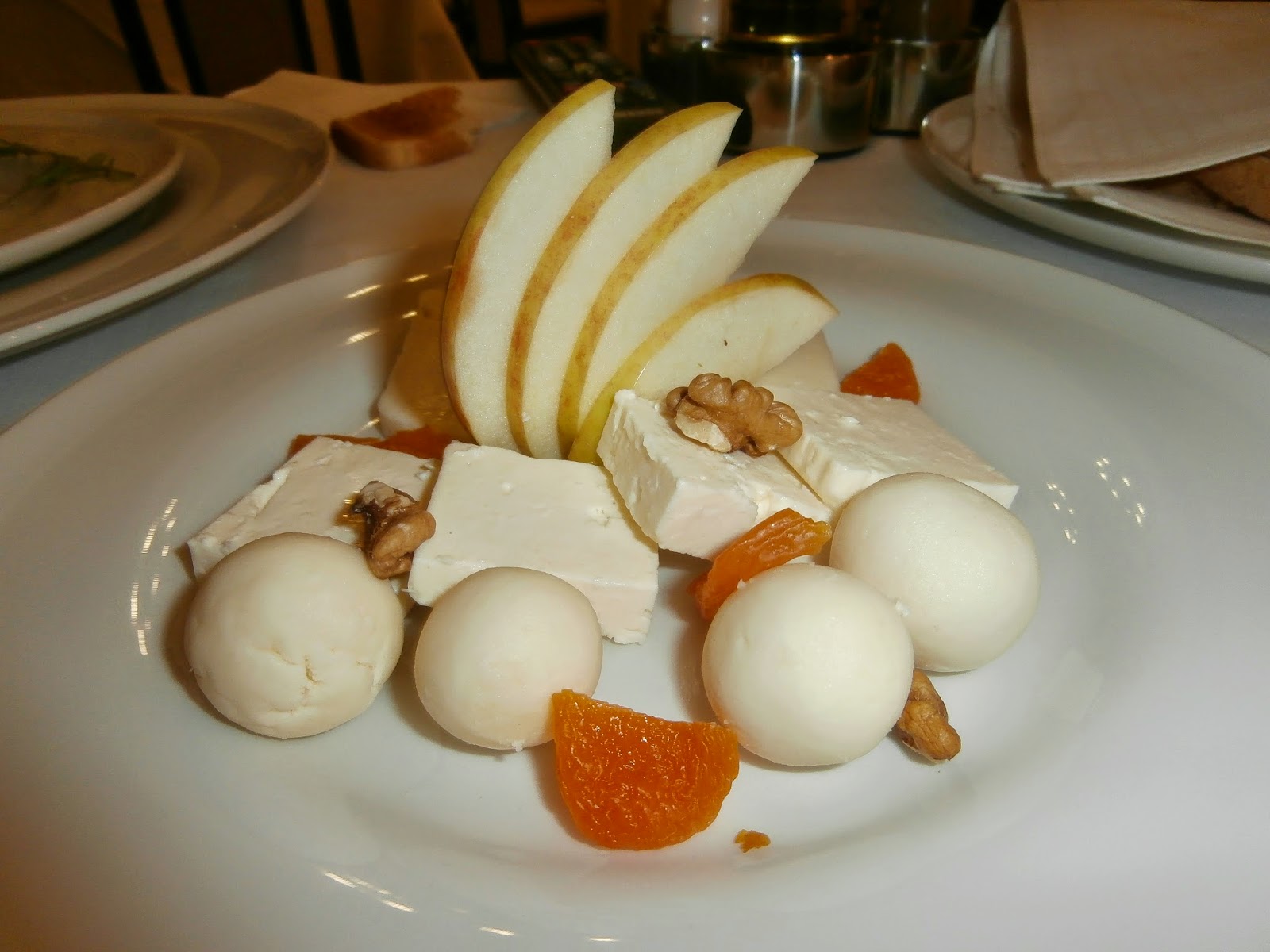 Para abrir boca, pudimos descubrir una variada selección de quesos locales, elaborados a partir de leche de cabra, de vaca y de oveja, todos ellos poco curados, frescos con buena acidez y muy alta intensidad de sabor, acompañados de nueces, manzana y orejones (o también conocidos como albaricoques secos). Ideal para abrir el apetito y conocer una nueva faceta típica de esta región.
