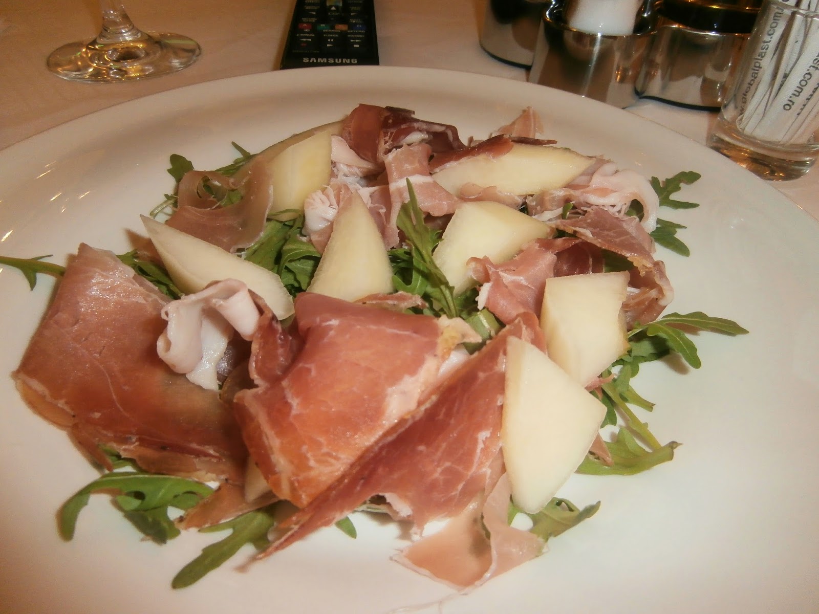 Pero claro, como las buenas costumbres no se deben perder y en la gastronomía española, un buen queso siempre debería ir acompañado de un buen jamón, pues osamos a pedir al camarero su homólogo en este país. Por tal motivo y aprovechando la gran influencia que ejerce en Rumanía, las costumbres italianas, no tuvimos más alternativas que saborear un buen Prosciutto con melón.