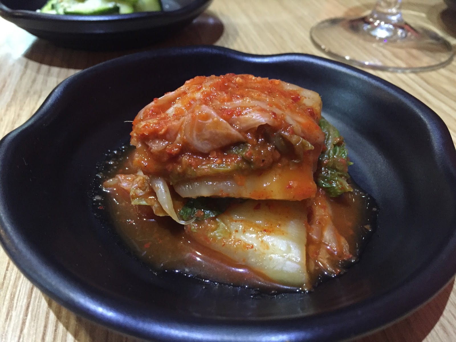 Después de escuchar atentamente las recomendaciones que nos dieron y que nos pusieran unos entrantes, entre los que destaca el Kimchi, un alimento que forma parte del día a día de los coreanos, a base de col china fermentada, ají molido y pimiento rojo, que sabe bastante picante, pedimos gyozas de entrante, unas empanadillas de cerdo con cebolla, zanahoria y calabacín con vinagre de soja, que he de decir que son de las mejores que he probado últimamente.Gyoza