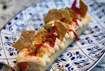 Para aprovechar el máximo el momento álgido de cada producto, la parte central de su carta cambia a menudo, con la frecuencia necesaria para presentar todo aquello que está en su mejor momento. En la sección “Del Mercado” vemos un Trinxat de Kale y bimi con jengibre y menta, o un Brazo de gitano ruso, una forma diferente y más atractiva visualmente de tomar una ensaladilla rusa.
