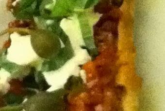Comenzamos con una tostada de pan de cristal con tomate, queso, alcaparrones... todo bien aliñado con aceite de oliva. Delicioso aperitivo recomendado para compartir (aunque cueste ;).