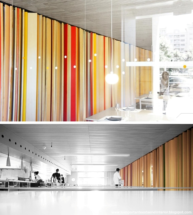 Otro gran protagonista del espacio es la pared lateral realizada con lamas verticales que recrean el bosque de hayas en el que la pareja de propietarios suele pasear. Los colores de los tableros, colocados aleatoriamente, son la abstracción de los cromatismos de este bosque a lo largo de las estaciones del año. La luz que entra por el gran ventanal de la fachada produce reflejos en las lamas similares a los de un hayedo.