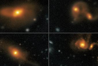 La mayoría de las galaxias tienen agujeros negros supermasivos en sus centros. También contienen cantidades sustanciales de gas, pero la mayor parte del tiempo este gas orbita a grandes distancias de los centros de las galaxias, fuera del alcance de estos agujeros negros. Cuando dos galaxias se fusionan, las fuerzas gravitatorias impulsan el gas hacia el centro del sistema galáctico. Justo antes de que el gas sea consumido por el agujero negro de su núcleo, libera cantidades extraordinarias de energía en forma de radiación, lo que da lugar al brillo característico de los cuásares.