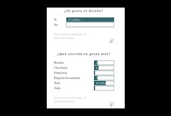 Os traemos los resultados de las dos encuestas que hicimos, a nadie le ha desagradado el diseño nuevo del blog (que alegría la verdad) y la otra encuesta era sobre las secciones del blog, asi que seguiremos con todas las que tenemos además de que aperezca alguna nueva.La nueva encuesta que está justo debajo de "seguir por mail" os preguntamos sobre el género literario que os gusta más leer.