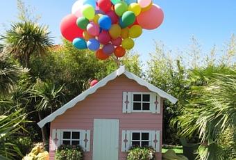 Por fin te envío las fotos de la casita. El pasado domingo fue el cumpleaños de mi hija y como no pudimos envolverla le pusimos un montón de globos en el tejado, imitando la peli "Up". Le encantó y no hay para menos, creo que ha quedado espectacular.