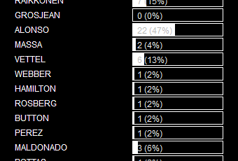 Para el cercano GP de Malasia, F1 by Riki ha llevado a cabo, como de costumbre, las escuentas en las que se le pregunta a la comunidad visitante ¿quien cree que ganara el proximo GP de F1?; como en la mayoria de las ocasiones, el ganador ha resultado ser Fernando Alonso, Kimi Raikkonen fue segundo apenas por un voto sobre Sebastian Vettel.De esta forma, Alonso logra su segundo triunfo en el campeonato de encuestas de F1 by Riki del 2013, para ver todos los resultados, votos y datos de los campeonatos anteriores; entra en mi seccion de encuestas, el enlace lo puedes ubicar en la columna lateral.
