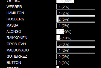 En las encuestas de F1 by Riki para el GP de Japon el piloto de Red Bull sigue dominando, esta vez no gano por la diferencia minima ante Fernando Alonso, sino por mas del doble de los votos; por otra parte, en las encuestas para la Pole Position fue Lewis Hamilton quien gano.Lamentablemente el piloto Español gano las primeras 9 de 10 encuestas de la temporada (una fue anulada por fallos del servidor) y ya habia sido coronado campeon 2013, ya que el de Red Bull ha venido remontando y posiblemente quede a solo una o dos victorias del de Ferrari a finales de este año, por otra parte, en las encuestas de la pole position, Vettel continua a la cabeza empatado con Alonso a 4 triunfos cada uno, ahora Hamilton esta en la P2.