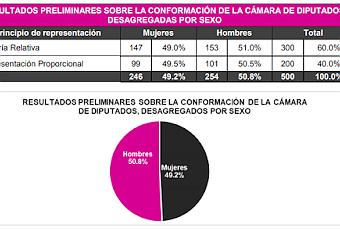 Al respecto cabe destacar que, mediante el Acuerdo INE/CG508/2017, para el registro de candidaturas de los distintos cargos de elección popular que presenten los partidos políticos y, en su caso, las coaliciones ante los Consejos del Instituto para el Proceso Electoral 2017-2018, el Consejo General del INE aprobó que al menos, dos de las cinco listas de representación proporcional deben estar encabezadas por mujeres. Lo anterior, con el fin de asegurar que más mujeres accedan a la representación política en la Cámara de Diputados.En los curules de representación proporcional, las mujeres podrían tener un mayor porcentaje de candidaturas electas, con 49.5%, que se traduce en una diferencia de apenas 2 curules. Ya que, de los 300 distritos de mayoría relativa, las mujeres obtendrían el 49.0% de los mismos, que implica una diferencia de 6 curules respecto a los obtenidos por hombres.Esto demuestra que las mujeres son igualmente competitivas que los hombres ante el electorado.Para el caso de las candidaturas electas por el principio de representación proporcional, las mujeres obtendrían el 49.5% de las curules, mientras los hombres el 50.5%, esto significa que apenas hay una diferencia de 2 curules entre uno y otro sexo. INTEGRACIÓN PRELIMINAR DEL SENADO DE LA REPÚBLICA