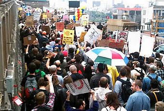 Son detenidas dieciséis personas en manifestación de “Occupy Wall Street” frente a Goldman SachsEn las últimas noticias del movimiento “Occupy Wall Street”, al menos dieciséis personas fueron detenidas el jueves mientras protestaban frente a las oficinas centrales de Goldman Sachs en Nueva York. Entre los detenidos, estaban el periodista Chris Hedges y el artista y activista Reverend Billy.