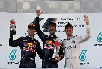 El piloto de Red Bull, Daniel Ricciardo, se impuso en el GP de Malasia 2016, segundo culminó su compañero de equipo, el holandés Max Verstappen y tercero, tras haber quedado último en la primera curva de la vuelta inicial de la carrera, un alegre y reivindicado líder del mundial, Nico Rosberg, quien ahora cuenta con 23 puntos de ventaja sobre su coequipero, Lewis Hamilton; este último abandonó la carrera por un fallo en el motor mientras iba primero y sin rival para alcanzar el triunfo en Sepang.