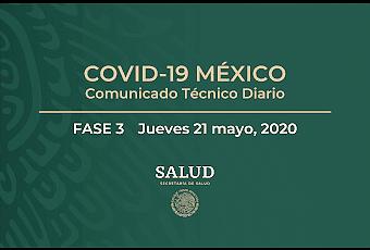 Consulta aquí el PDF completo.· Confirmados acumulados: 59,567· 2,973 casos nuevos acumulados· Defunciones: 6,510· 420 nuevas defunciones· Casos Activos: 12,905· 820 reportados más que ayer· Sospechosos Acumulados: 33,291· Negativos Acumulados: 108,980· Personas Estudiadas: 201,838.-El Director General del ISSSTE, Luis Antonio Ramírez Pineda, resaltó la fundamental labor de las y los psicólogos ante la pandemia COVID-19, ya que su capacidad de respuesta e innovación para atenuar efectos en salud mental colectiva ha despertado el interés y reconocimiento de la comunidad internacional.https://bit.ly/2AS6j4X-El Presidente Andrés Manuel López Obrador conmemoró este jueves el primer centenario del aniversario luctuoso del ex Presidente de México, Venustiano Carranza.-La Secretaria de Gobernación, Olga Sánchez Cordero, pidió a los municipios corresponsabilidad en el combate a la violencia de género.-El Secretario de Educación Pública, Esteban Moctezuma, destacó la necesidad de realizar una evaluación diagnóstica durante el regreso a clases presenciales para conocer dónde existen rezagos para remediarlos.-Los coordinadores de los diputados y senadores de Morena ofrecieron revisar la iniciativa de extinguir fideicomisos y escuchar a la sociedad.-Legisladores de Acción Nacional pidieron al director de la Comisión Federal de Electricidad, Manuel Bartlett, que el cobro del servicio de energía eléctrica se aplique con la tarifa más económica y suspender los cortes por falta de pago, a fin de apoyar a millones de hogares.-El dólar finalizó la jornada con una caída de 27 centavos, a 23.27 pesos a la venta y 22.30 a la compra en Citibanamex.-La ocupación hospitalaria en la Capital del País es de 80 por ciento, informó la Jefa de Gobierno, Claudia Sheinbaum.-Claudia Sheinbaum, planteó la realización de pruebas rápidas para la Ciudad de México.-Debido al aumento de casos de Covid-19 y la movilidad de la gente, Acapulco no entrará a la "nueva normalidad" el primero de junio.-La Gobernadora de Sonora, Claudia Pavlovich, informó que dio negativo a la prueba de Covid-19.-Tras los ataques registrados contra corporaciones policiacas, que iniciaron la noche del miércoles y continuaron este jueves, el Gobernador Javier Corral advirtió que están alerta porque se prevén más agresiones.-La propagación del nuevo coronavirus en Latinoamérica se está acelerando, con Brasil a la cabeza, cuando los casos confirmados en todo el mundo superan los cinco millones.-El Gobierno español calcula que el turismo extranjero podrá retornar de forma segura en julio, dijo la vicepresidenta cuarta del Ejecutivo, Teresa Ribera, quien advirtió de que una apertura prematura y masiva sería una "irresponsabilidad" que pondría en riesgo a la población.