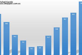 En el siguiente gráfico podemos ver el balance hídrico neto mes por mes, es decir, la diferencia respecto a lo que debería de haber llovido según la media.