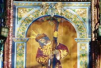 Con un marco un tanto estropeado por las defecaciones columbiarias, este retablo cerámico dedicado a Nuestro Padre Jesús del Gran Poder se puede ver desde la puerta de la calle del número 79 de la Avenida de la Borbolla, casa con el nombre de Villa Lucía.