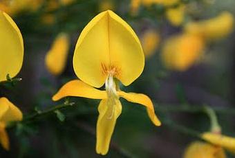 Arbusto caduco, alto, con tallos siempre verdes de sección angulosa. Sus hojas son pequeñas, simples en la parte superior y trifoliadas en la base. Las flores axilares son grandes, solitarias o agrupadas en pares, de color amarillo muy intenso, o combinadas rojas y amarillas. El fruto es una vaina chata, negra y pubescente. Se multiplica por semillas en la primavera y por estacas en el verano.