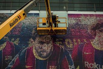 La imagen principal, la que daba la bienvenida a los aficionados culés, fue retirada muy temprano este martes, al igual que otras gigantografías que se mantenían en otros espacios del escenario deportivo.