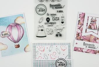 Puedes usar papeles, troqueles, pegatinas y demás materiales, pero solo un pack de sellos y tienes que usarlos en las tres tarjetas.Yo he utilizado un pack de sellos de Kora Projects de una colección que se llama From de Sky Baby Girl. Los papeles también son de la misma colección. Y estas son las tres tarjetas que he realizado hoy: