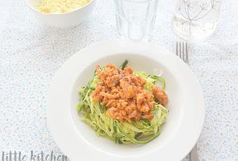 Servir los calabacines y poner encima la boloñesa. Si queréis podéis coronar con queso rallado.
