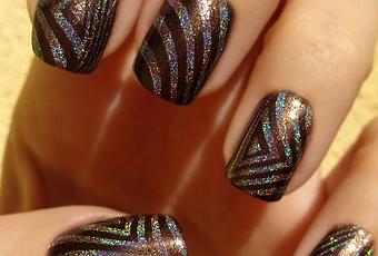 Es un marrón con un toque dorado muy bonito. En la foto se aprecia bien este toque dorado en la parte superior del bote. Pero claro, el protagonismo se lo lleva la estampación con un esmalte holográfico, que me ha tenido mirando las uñas y flipando el tiempo que he lucido la manicura (que han sido varios días).