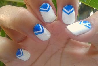 Esta vez he optado por realizar una manicura sencilla, la he hecho así para no dejar a un lado lo hermoso que luce el color blanco. Solo he realizado un triángulo en tono azul, con la ayuda de un nail tape.