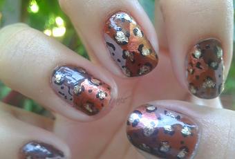 Esta vez he realizado un nail art de animal print, sobre esmaltes de diversos tonos de marrón. Esta vez he utilizado cuatro tonos de la gama de los marrones y sobre ello realice manchas con acrílica negra simulando las manchas de un leopardo por último en algunas de las manchas puse puntos con esmalte dorado.