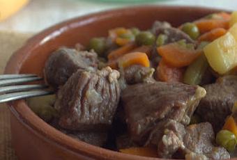 Ingredientes:750gr. de aguja de ternera en trozos;150gr. de cebolla;2 cucharadas de tomate concentrado;100gr. de judías verdes;100gr. de guisantes;100gr. de zanahorias;200gr. de patatas;sal, pimienta y nuez moscada;aceite de oliva