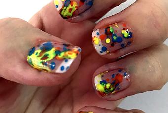 Es una manicura que puede ser muy engorrosa y sucia. Os recomiendo usar un guante de latex al que le cortes un poco las puntas de los dedos para que asomen solo las uñas y así mancharte menos. En este caso como os comentaba no apliqué un color de base sino simplemente apliqué la base de uñas de Masglo para después en una paletita colocar los colores que iba a usar con un poquito de agua para que fuera más fácil obtener las salpicaduras. Con el pincel de abanico y ligeros golpes fui salpicando las uñas con los distintos tonos y cuando estuvo todo bien seco apliqué el brillo gel de Masglo para proteger. Como eran pinturas acrílicas simplemente con agua y jabón se me fueron las manchas que cayeron fuera de las uñas, en el caso de usar esmaltes habría que limpiar con quitaesmalte y un pincelito o palito de algodón el exceso de esmalte fuera de las uñas. Esto es lo que yo utilicé.