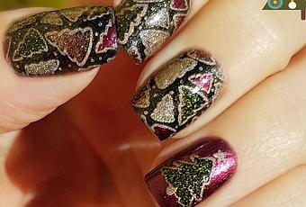 Elegí una base verde oscuro con destellos dorados para todas las uñas salvo de la del anular, que acentué en un tono granate. Sobre las uñas verdes coloqué reverses de pequeños arbolitos de colores (incluyendo el tono granate), y sobre la uña acentuada coloqué un sólo árbol, más grande, verde holográfico. La estampación está hecha con un esmalte holográfico beige oscuro/topo que podría pasar por dorado...