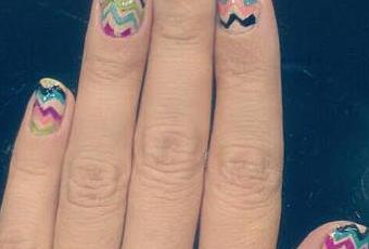 Hola chic@s, aquí vengo con otra manicura del reto. Hoy toca CHEVRON NAILS, una manicura basada en líneas triangulares o triangulitos de colores.