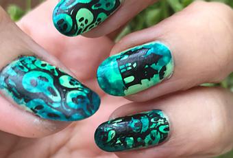 Os comento los productos que usé para esta manicura. En primer lugar para proteger usé mi base favorita, la Base de Uñas fuertes de Masglo. Después apliqué dos capas del Pecadora de Masglo por ser el tono más claro que tenía de verde para que fuera la base sobre la que trabajar y luego con una esponjita como os comentaba aplique con ligeros toques otros 3 tonos de verde, el Auténtica y el Salvaje de Masglo y el verde metalizado de Leticia Well. Sobre ello estampé los motivos de la placa 03 de BeautyBigBang y para proteger la manicura el BrilloGel de Masglo.
