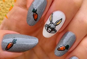 En las uñas del pulgar, índice y anular tenemos una zanahoria, que es el manjar favorito de nuestro conejito. Estas zanahorias son un diseño de uña completa, del que recorté las tres que hay en la manicura. Además, son kawaii con caritas cuquis, que borré porque en esta manicura no me interesaba ese toque cuqui.